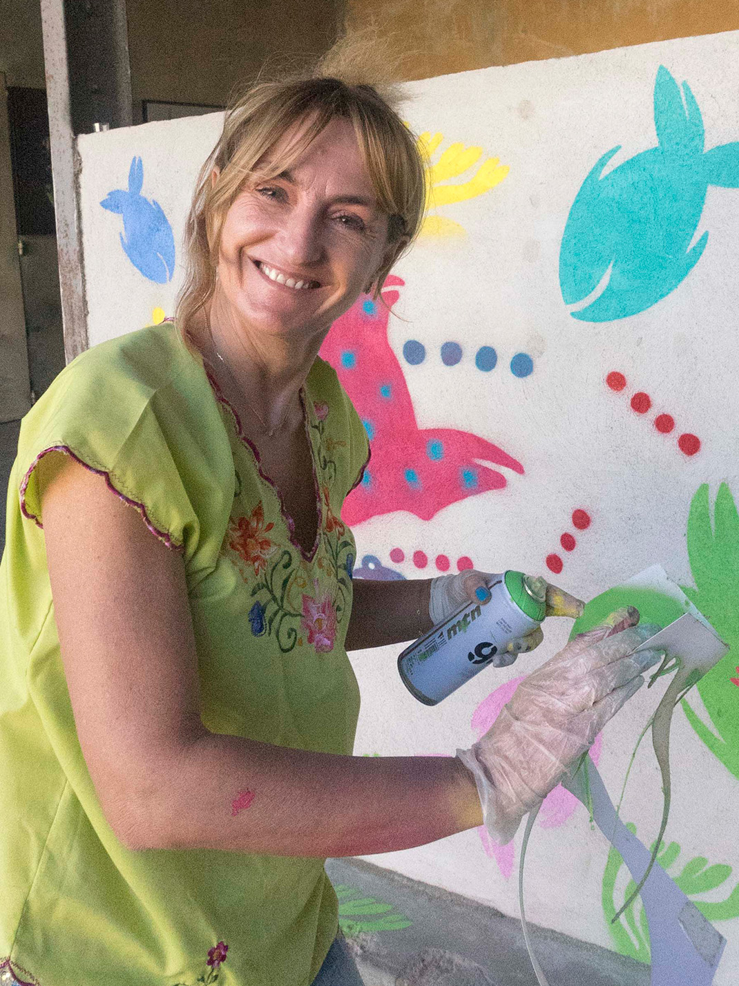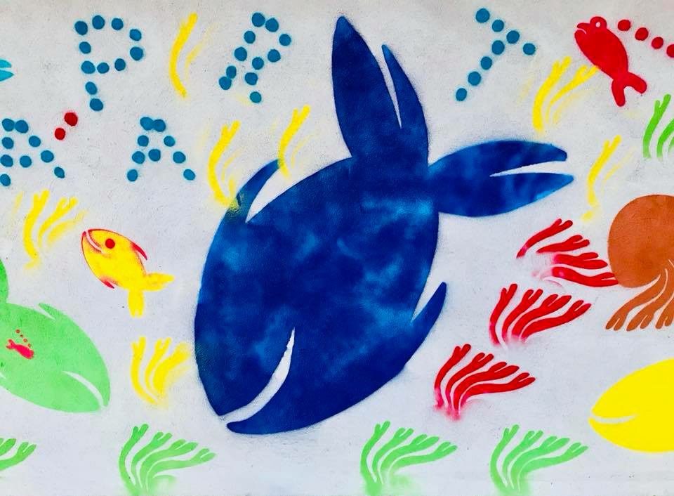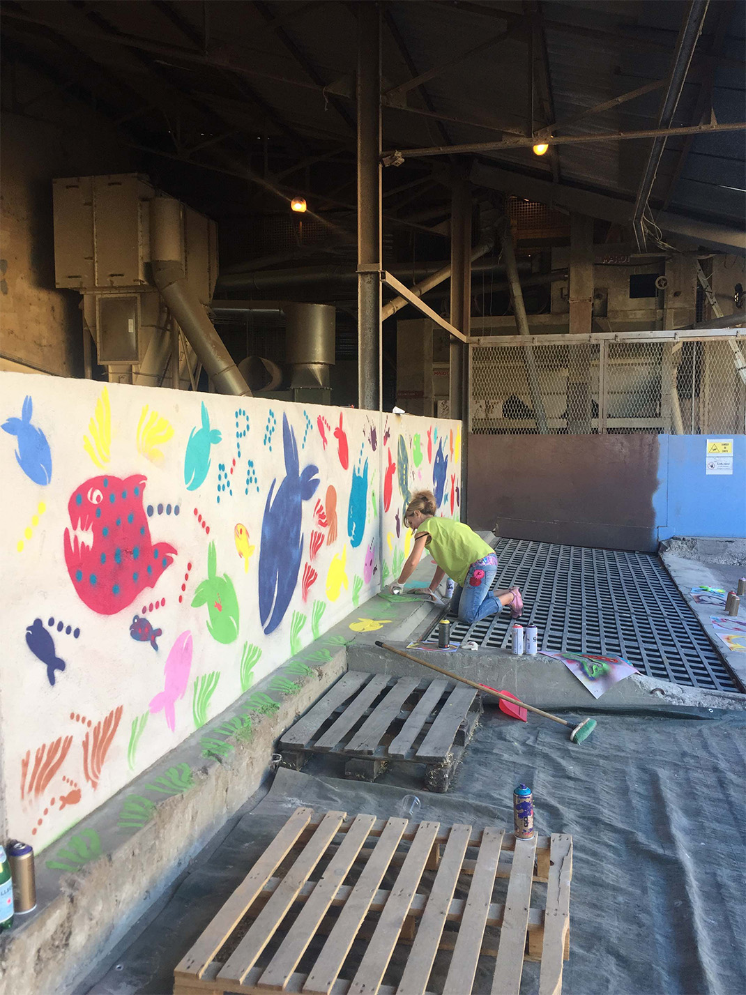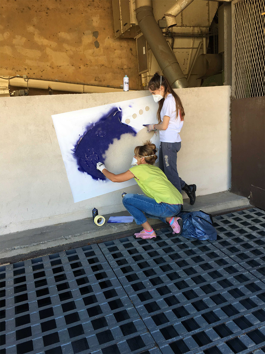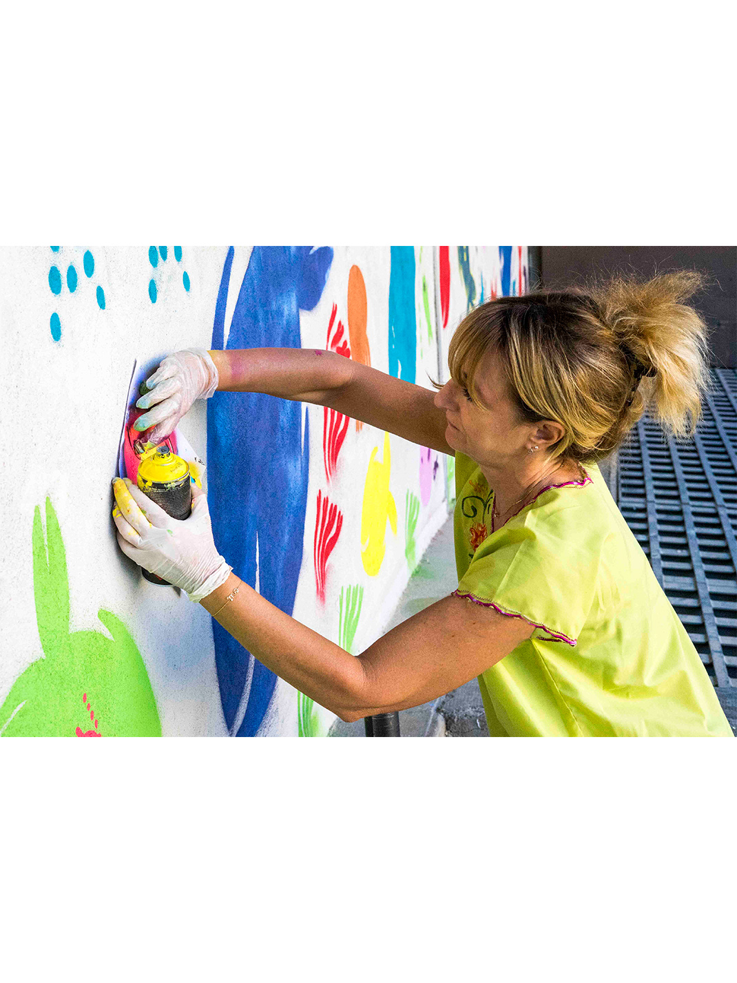 Bombe aérosol sur mur, environ 150 x 700 cm.