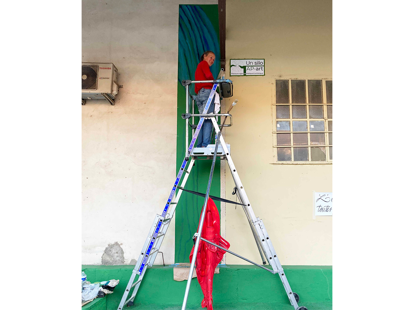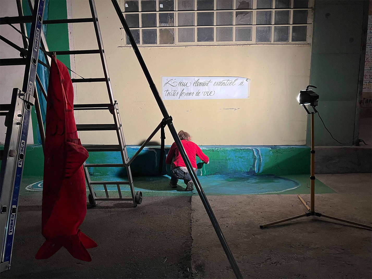 Tamara Milon L’eau, élément essentiel à toutes formes de vie, 2024. Peinture acrylique et peinture routière sur sol et mur.